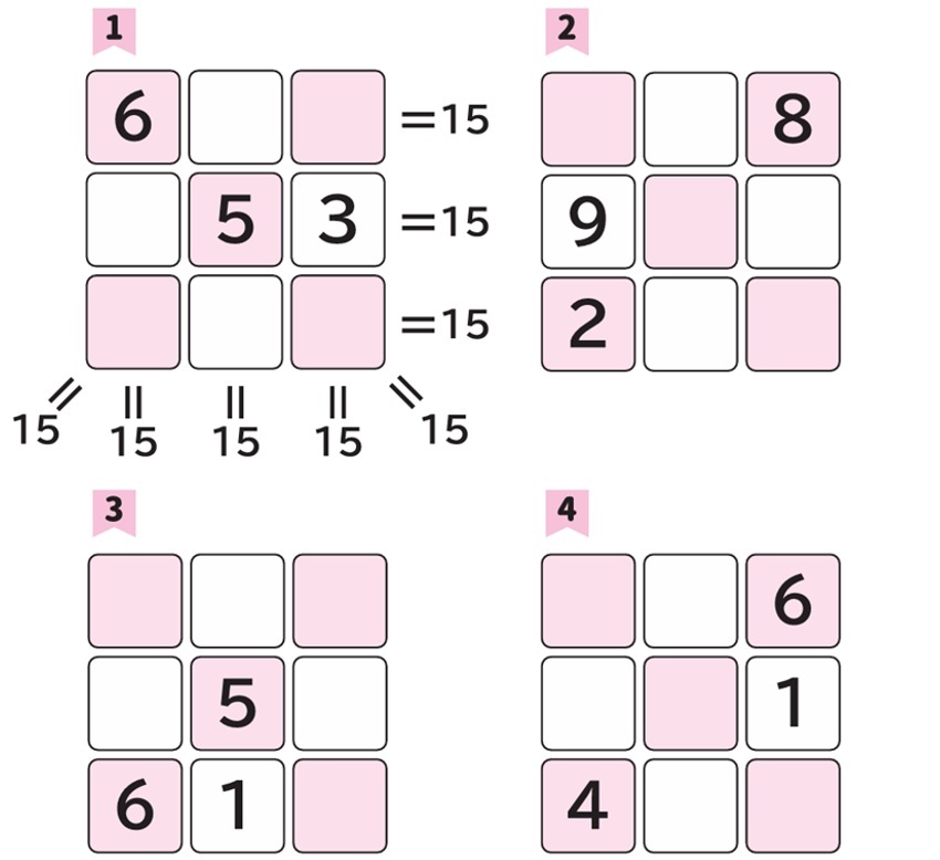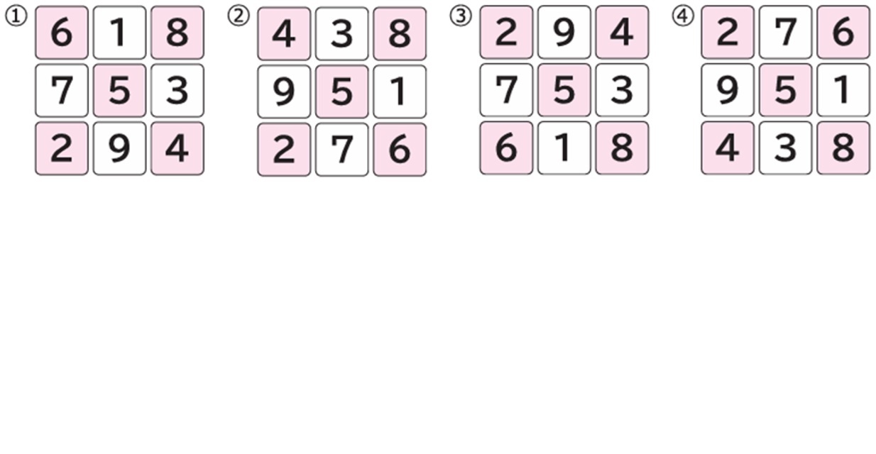1~9の数を1度ずつ使って、タテ・ヨコ・ナナメに並ぶ3つの数を足した和=15、になるように空きマスに、1~9で使われていない数を書きましょう。