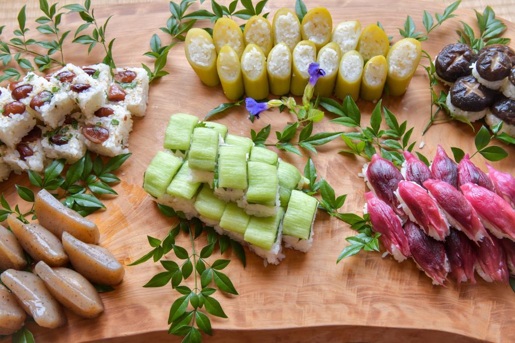 寿司のネタは自然ゆたかな高知の恵みがいっぱい。高知はミョウガの産地として有名ですが、そのミョウガを前日からゆず酢につけておいたもの。近くの山でつくっているというシイタケを甘く煮たもの。やはり甘く煮たこんにゃくと金時豆。5月にとれるハチクというタケノコを湯がいて保存していたもの。そして緑色がみずみずしいリュウキュウ。