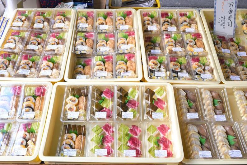 この日曜市には、近郊でとれた新鮮な野菜や果物、太平洋で揚がったシラスなどの海産物、手づくりのお菓子や雑貨など、高知の恵みが大集合。見て歩くだけで気分が盛り上がります。なかでも目をひいたのは、パックに入ったお弁当ならぬ、野菜のお寿司。ミョウガやシイタケ、こんにゃく、タケノコ、リュウキュウ(里芋やハスイモの一種で茎のみを食べる)などが載って彩り鮮やか。日曜市では何軒ものお店がこの田舎寿司を出していました。土佐(高知)ではハレの日の家庭料理のひとつとして、それぞれの家の味があるのだそうです。