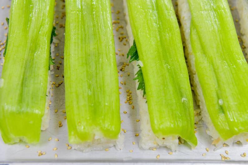 さあ、いただきます!りゅうきゅうは歯ごたえがしゃくしゃく。シイタケの甘みと爽やかな酢飯がよく合います。ハチクは真ん中にご飯が詰められていて、タケノコの海苔巻きのよう。初めて食べました!さっぱりしていくつでも食べられそうです。