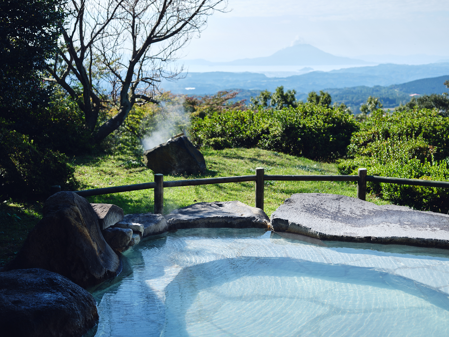 展望風呂からは、晴れた日には桜島の雄姿を遠望することもできます。雄大な景色とともに味わう温泉は、霧島ならでは。