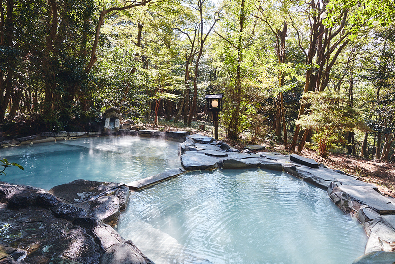 敷地内の森の中にある貸切露天風呂も人気です。小径を歩いて向かうひとときから、非日常の時間が始まります。岩造りの湯船に浸かれば、鳥のさえずりや風に揺れる木々の音が心地よく響き、自然と一体になるような感覚に包まれます。夜には星空を仰ぎながら、静寂の中でゆったりと湯浴みを満喫できます。