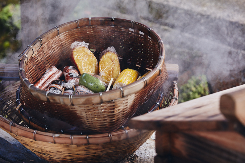 温泉でのんびりした後は、近くの霧島温泉市場へ。土産物店や食事処のほか観光案内所も併設され、広場には足湯や蒸し物販売所もあります。温泉の蒸気で蒸しあげたばかりの本場のサツマイモは絶品。名湯と絶景、そして土地の恵みを味わえる霧島温泉です。