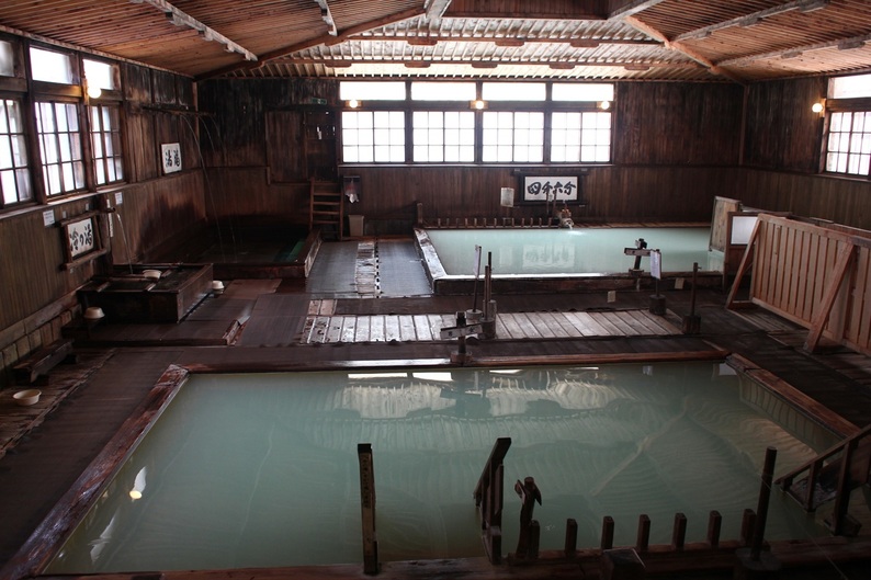 総ヒバ造りの名物「ヒバ千人風呂」には、熱の湯・冷の湯・四分六分の湯・湯滝と、4つの異なる源泉があります。160畳もの広さの浴場には湯気がふんわりと立ちこめ、白くけむる中をお湯が滔々と流れていく様子は、思わず見入ってしまうほど。pH2.0前後の強酸性の湯は“薬湯”として親しまれ、疲れをほぐしたり、肌を引き締めたりと、昔から愛されてきました。湯に浸かると少しピリッとした刺激を感じますが、それもまた酸ケ湯らしさのひとつです。混浴ではありますが、女性専用時間が設けられているほか、入口が分かれているため安心して入浴できます。白濁したお湯のおかげで湯の中はほとんど見えず、混浴時間に入る女性も少なくありません。